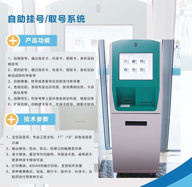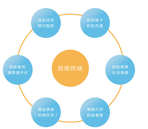 用户可根据需要选择其中的几种或者全部的功能模块,根据所选择的主要功能模块, 自助服务终端系统主流产品包括:自助挂号机,自助查询机,自助缴费机,自助建卡机, 自助报告打印机,自助清单打印机,自助挂号缴费机等设备及配套软件,行业内将此设备统称为自助服务终端。